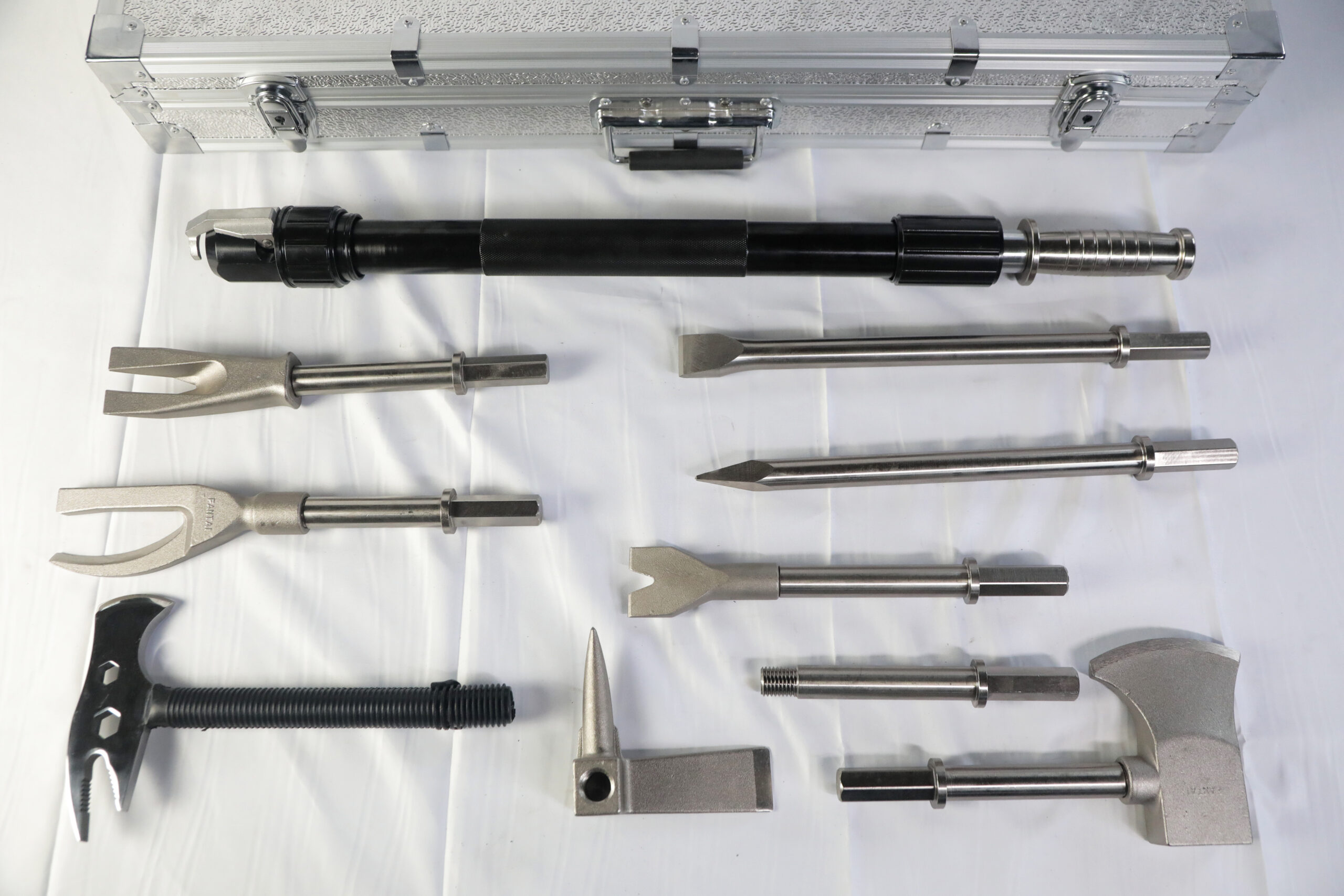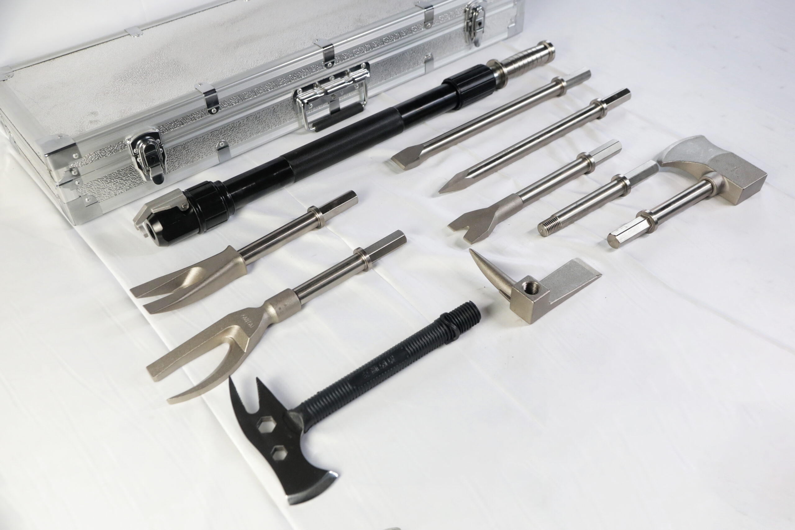 Kit includes: Sliding telescopic impact rod, pry lock puller, metal cutter, cross pry head, V-shaped wide chisel, flat chisel, pointed chisel, multifunctional waist axe, wide axe, connecting rod, aluminum alloy portable case.