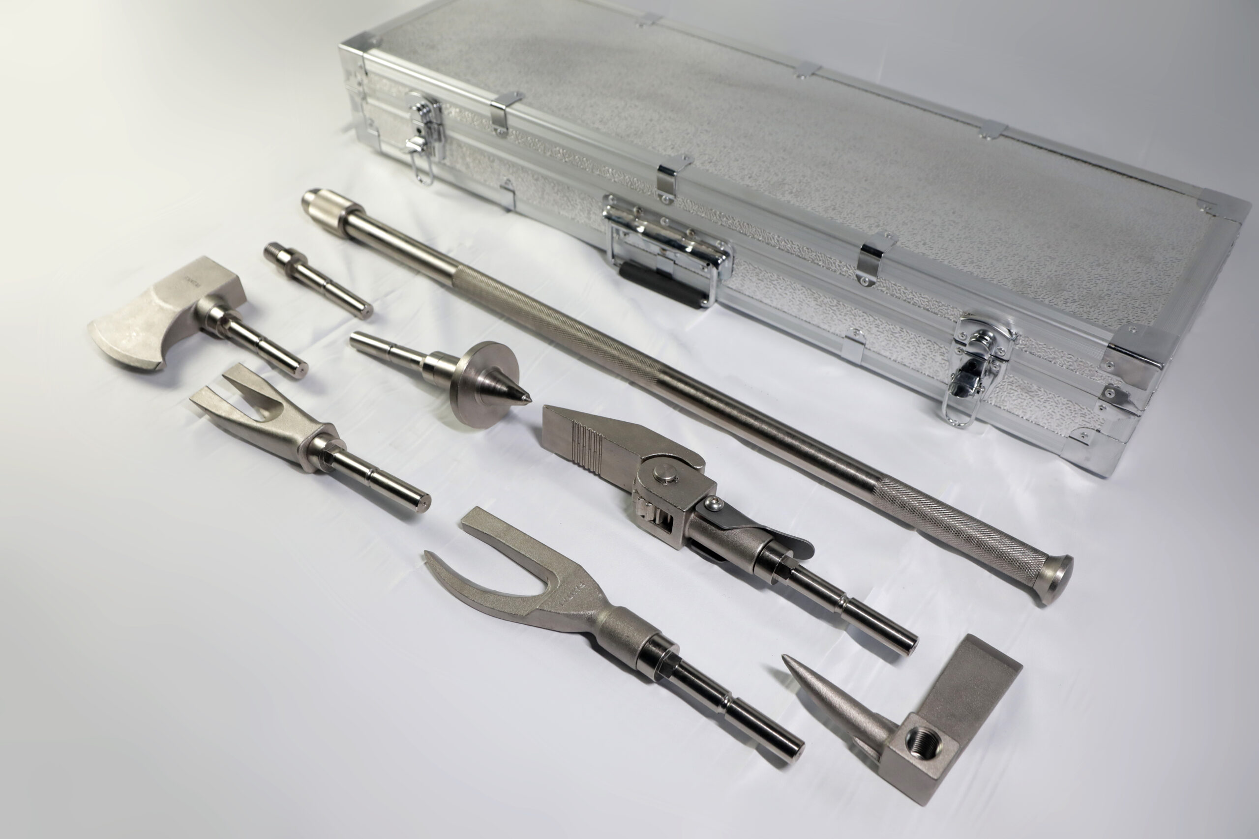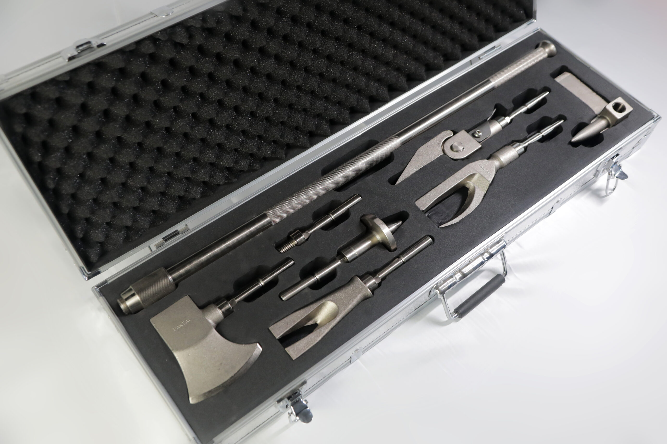 Kit includes: Axe lever, lock puller, metal cutter, cross pry head, wide axe, ratchet pry head, glass crusher, connecting rod, aluminum-alloy portable case.