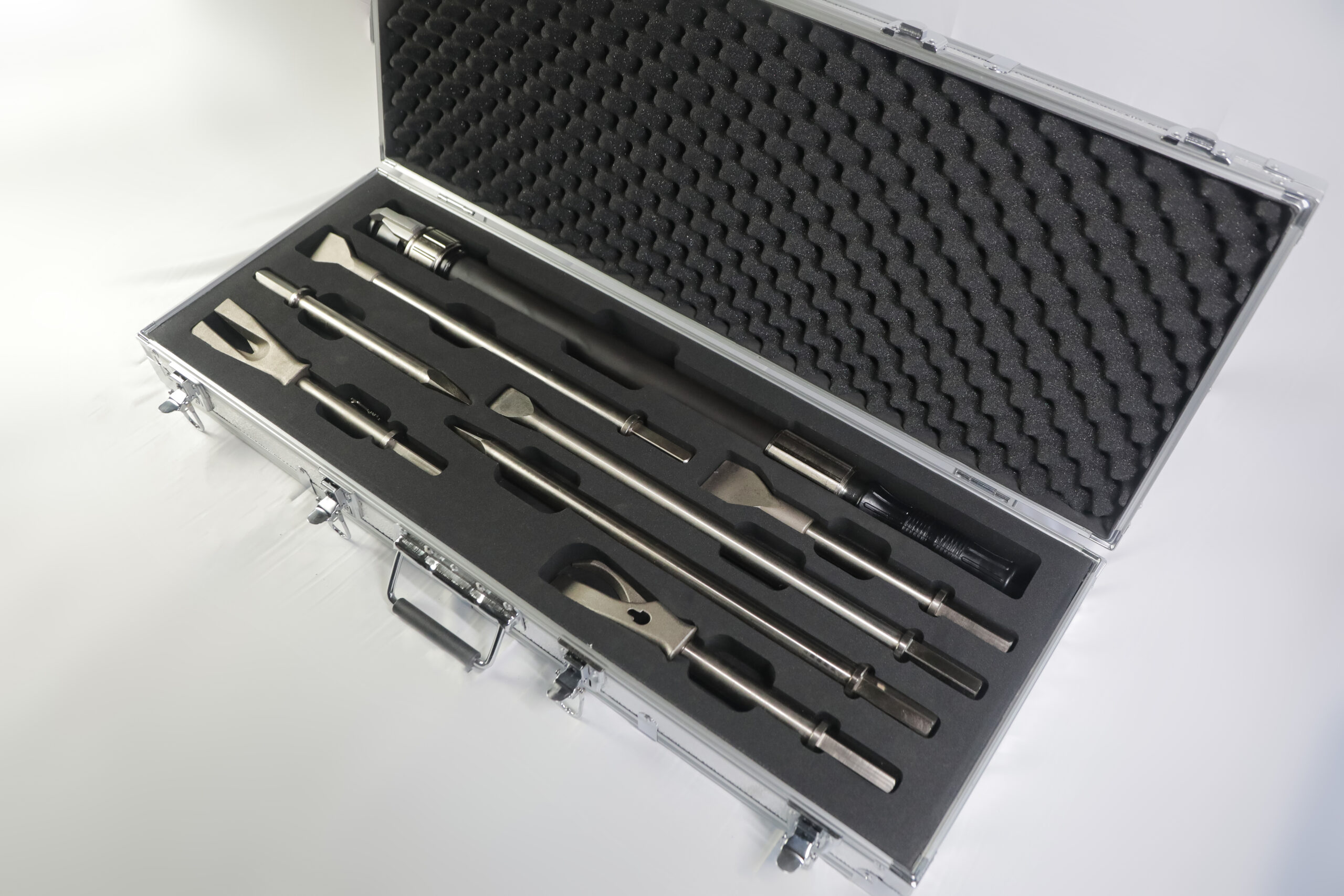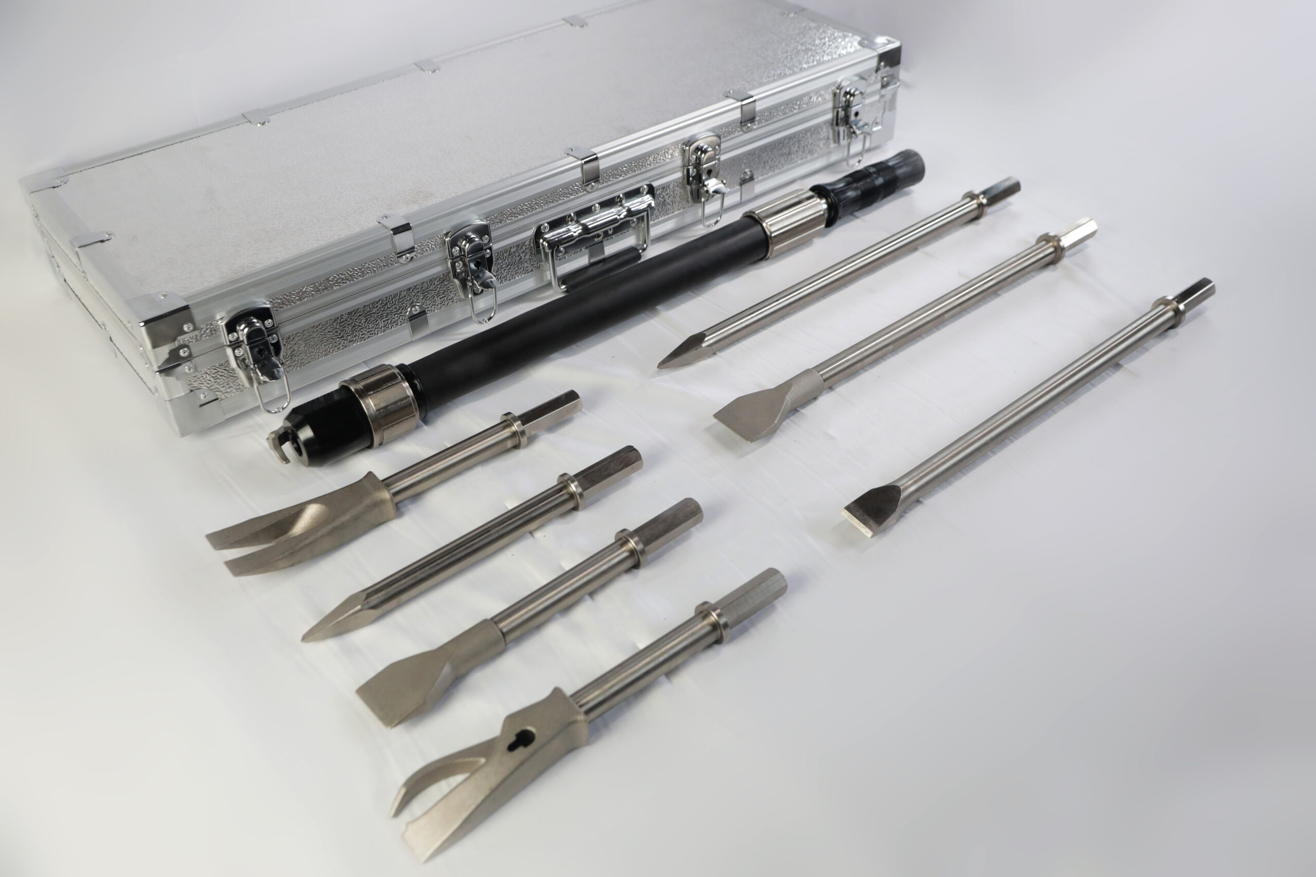 Kit includes: Sliding telescopic impact rod, pry lock puller, metal cutter, long wide chisel, short narrow chisel, long pointed chisel, short pointed chisel, V-shaped chisel, aluminum alloy box.