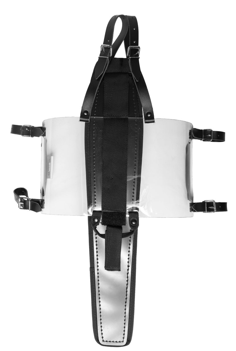 The equine face guard consists of a polycarbonate eye visor and three-layer muzzle pad to protect the horse from frontal attacks while maintaining the horse’s range of motion and field of vision.