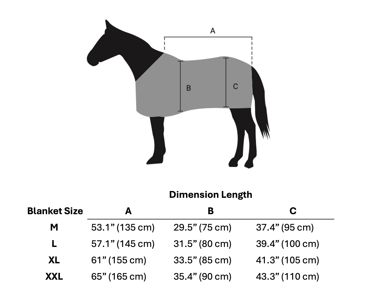 The blanket fastens to the horse with five 50 mm-wide straps: three under the horse’s belly and two around the horse’s chest.